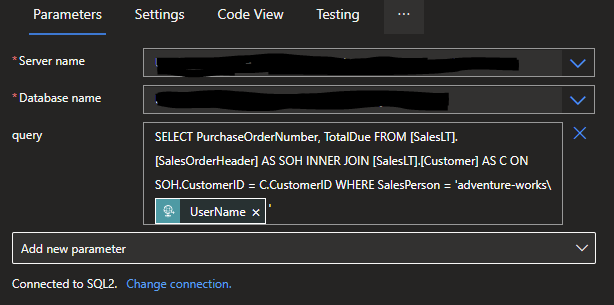 SELECT PurchaseOrderNumber, TotalDue FROM [SalesLT].[SalesOrderHeader] AS SOH INNER JOIN [SalesLT].[Customer] AS C ON SOH.CustomerID = C.CustomerID WHERE SalesPerson = 'adventure-works\@{triggerBody()?['UserName']}'