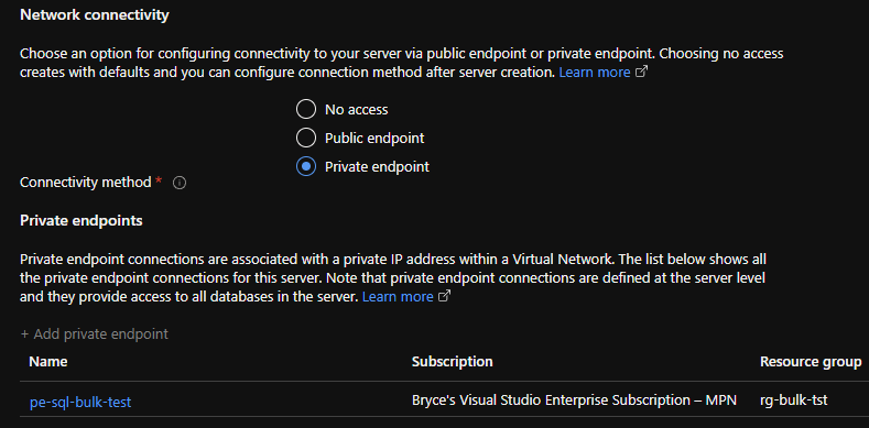 NOTE: If you forget steps or already have a Azure SQL Server and Database, these can also be done afterwards. Private Endpoint: Azure SQL Server > Private endpoint connections > +Private endpoint. Managed Identity: Azure SQL Server > Identity.