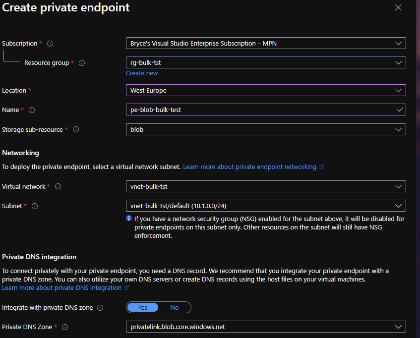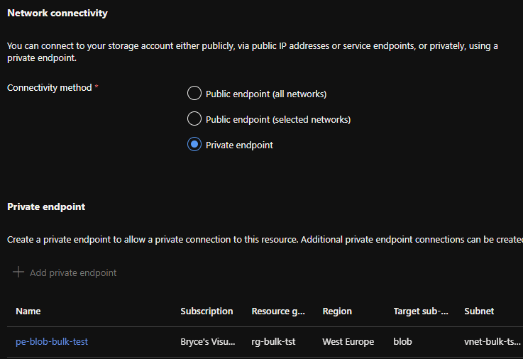 NOTE: If you forget steps or already have a Azure Storage Account, this can also be done afterwards. Private Endpoint: Azure Storage Account > Networking > Private endpoint connections > +Private endpoint.