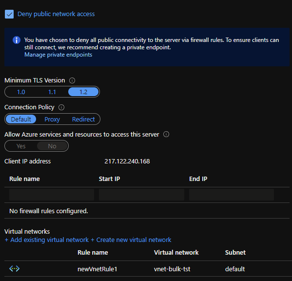 We now have to apply some settings which we couldn't add during creation. To do this, click on your Azure SQL Server and go to the Firewalls and virtual networks tab. Check the box with Deny public network access and continue by adding a virtual network by clicking on the Add existing virtual network and choose the VNet which was created earlier.