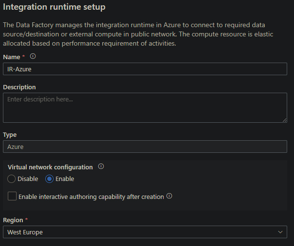 Due to the fact that we are still working with private networking we can't simply connect to the Azure Storage Account and Azure SQL Database. Before we can do this, we need to create a new Integration Runtime (IR).
