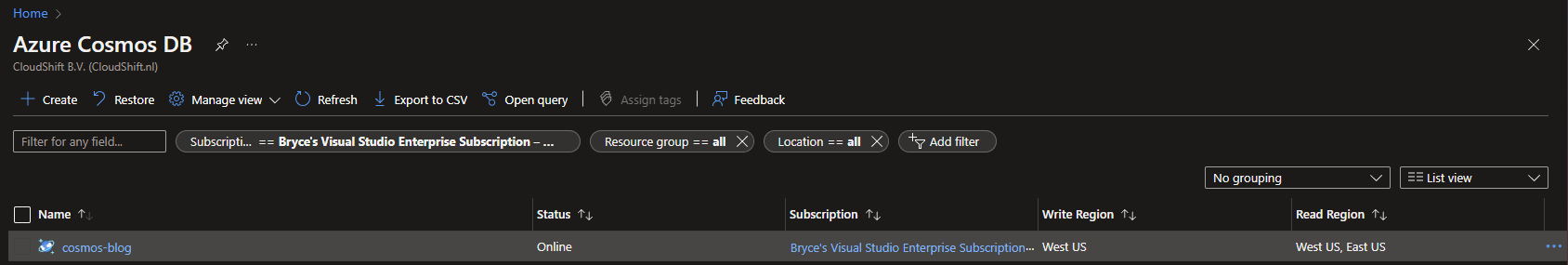 Before I ran my Experiment, my CosmosDB looked as follows: