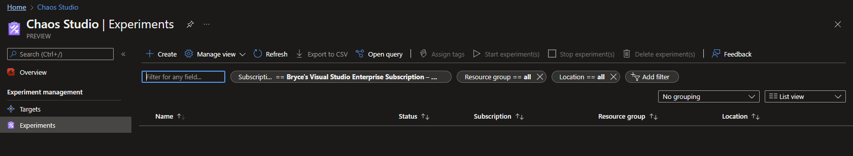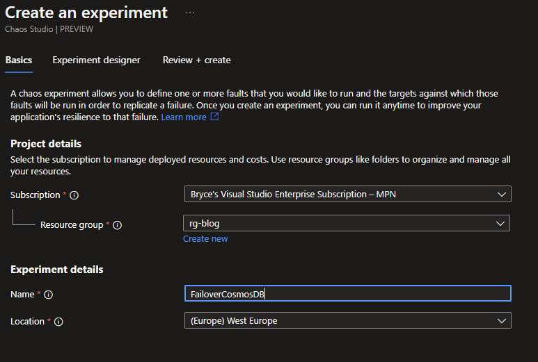 When experimenting via the Azure Portal, you will be asked to give your Experiment a proper name and location. I'm only testing for CosmosDB, but if you are testing all services for the specific workload of an application, you can give it a more generic name.