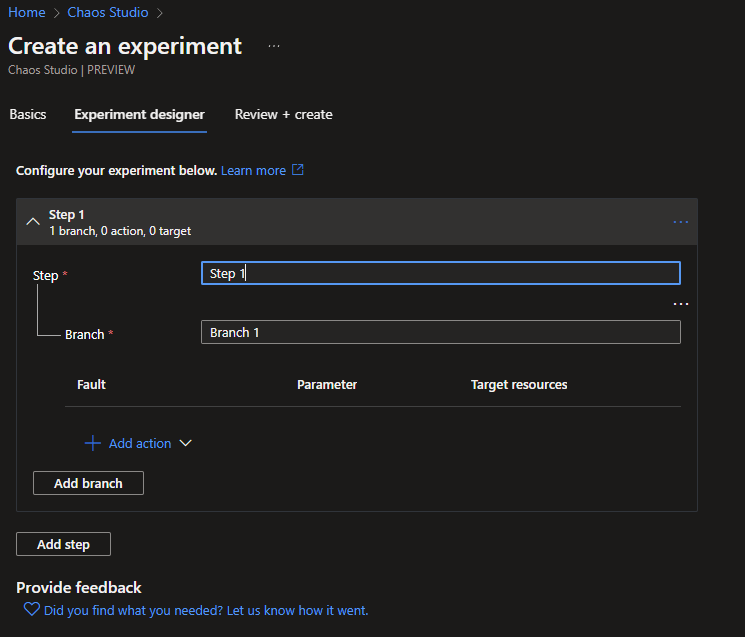 Continuing to the Experiment Designer, here you can create all the scenarios you want to experiment with. This can be done in certain steps and each step can have multiple Branches (Actions). Clicking on the + Add action button will give you the option to add a Fault or a Delay. Delays allow you to wait x amount of minutes before you continue, while Faults cause the actual damage.