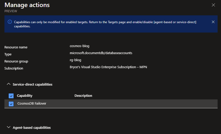 In my case, CosmosDB only has the Fault available to test its failover, so I'll keep this enabled.