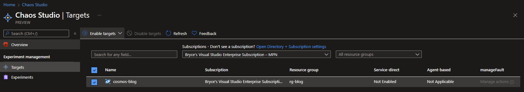 Within the Targets tab you can onboard all the Azure resources that are currently supported and you want to enable your tests on. When you want to onboard a resource you can do so by selecting it and clicking on the Enable targets button.