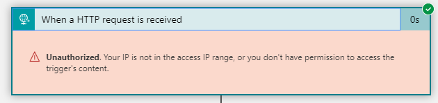If your IP address is not registered and you will make a call to the Logic App endpoint you will receive an Unauthorized error. When this happens, the Logic App will fail immediately and no further actions will be executed. The Specific IP ranges option is a nice safeguard to have in place and makes a great default in Logic App deployments via Infrastructure as Code (IaC).