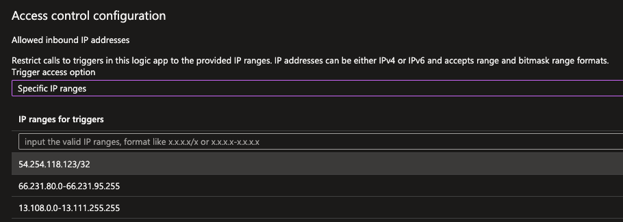 If we dive a bit deeper in the Specific IP ranges, you will be able to specify a range in the format of 66.231.80.0-66.231.95.255 or a specific static IP address such as 54.254.118.123/32. This follows the x.x.x.x-x.x.x.x and x.x.x.x/x pattern accordingly and allows your Logic App to only be called via these IP addresses.