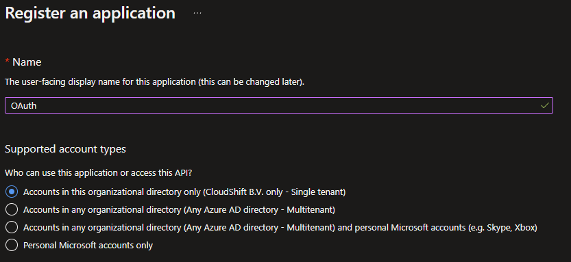 Continue by clicking on + New registration and give your registration a proper name, choose your Account type and add a Redirect URL, for example http://localhost.