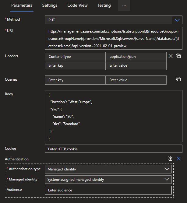 Back in the Logic App Designer, add a HTTP action. This will require some configuration to get up and running. In this example, I will use the HTTP action to scale down an Azure SQL Database via the Azure Rest API.