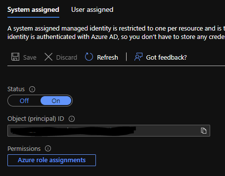 Stay in the System assigned tab and slide the Status option to ON. Don't forget to hit the Save button to finalize the change.