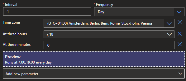 Select the Recurrence Trigger and set it to the required interval, time zone, hours and minutes. I went for 7 AM and 7 PM which should be reasonable time period for office hours.
