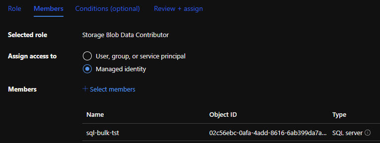 Go to the Members tab and at Assign access to, choose the Managed Identity option. Continue by clicking on +Select members and select your Azure SQL Server. Go to Review + Create and Create the Role.