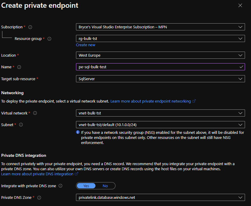 NOTE: If you forget steps or already have a Azure SQL Server and Database, these can also be done afterwards. Private Endpoint: Azure SQL Server > Private endpoint connections > +Private endpoint. Managed Identity: Azure SQL Server > Identity.