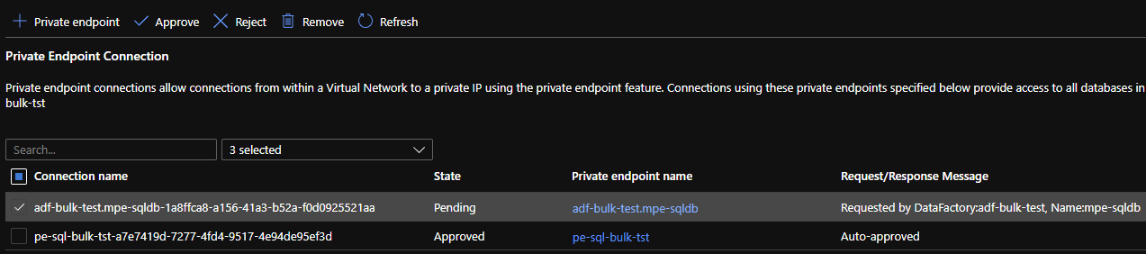 When you submit the creation it will show the Status Pending. Open a new tab and go to your Azure SQL Server and to the Private endpoint connections tab. You will see the new endpoint waiting for approval.