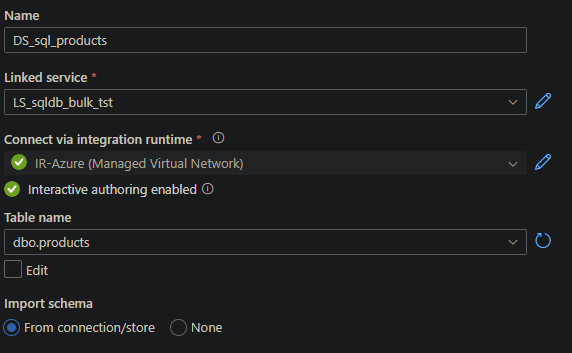 Click on Datasets and click again on the ... and select New Dataset. Search for the Azure SQL Database option, and click on it. Give the Dataset a proper name and select your linked service. Continue by selecting the dbo.products table and finalize it by clicking OK.
