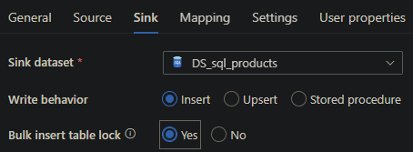 Move to the Target Tab and select your Azure SQL Database Dataset and select Yes at the Bulk Insert table lock option.