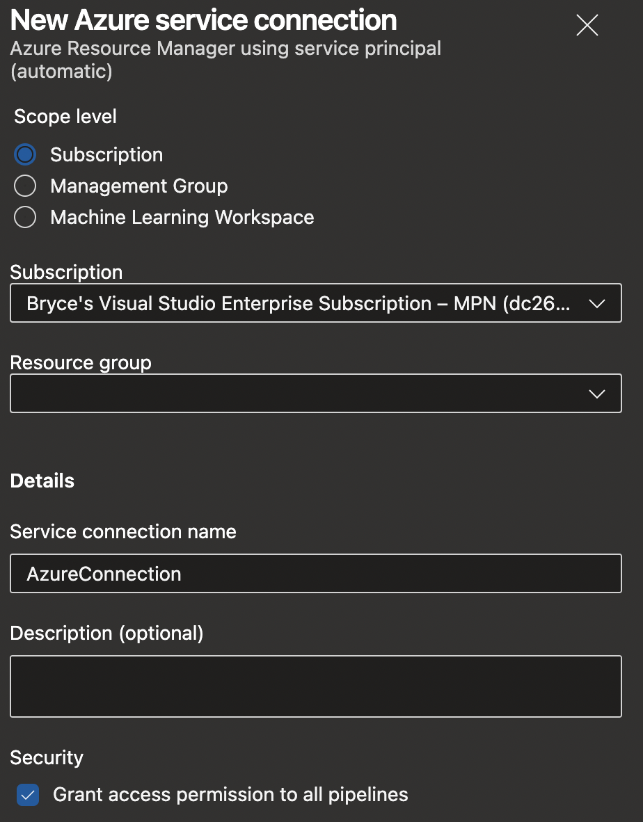Since we are about to automate a bit more, we need to have a Service Principal in order to execute specific Azure commands. For this we need an Azure Service Connection within our Azure DevOps environment.