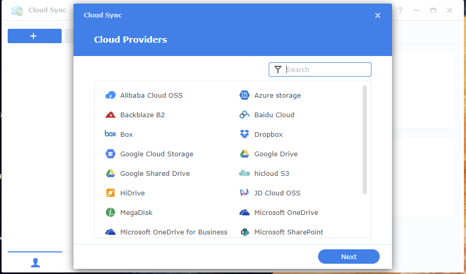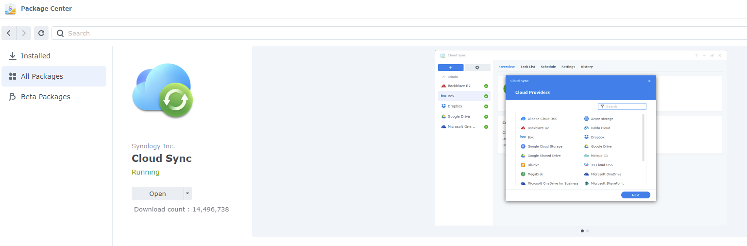 The configuration process is quite straightforward. To start with, the Cloud Sync package needs to be installed on your Synology system. This can be done by going to the Package Center, searching for Cloud Sync and pressing Install. After it is installed, you can click on Open or open it via the menu.