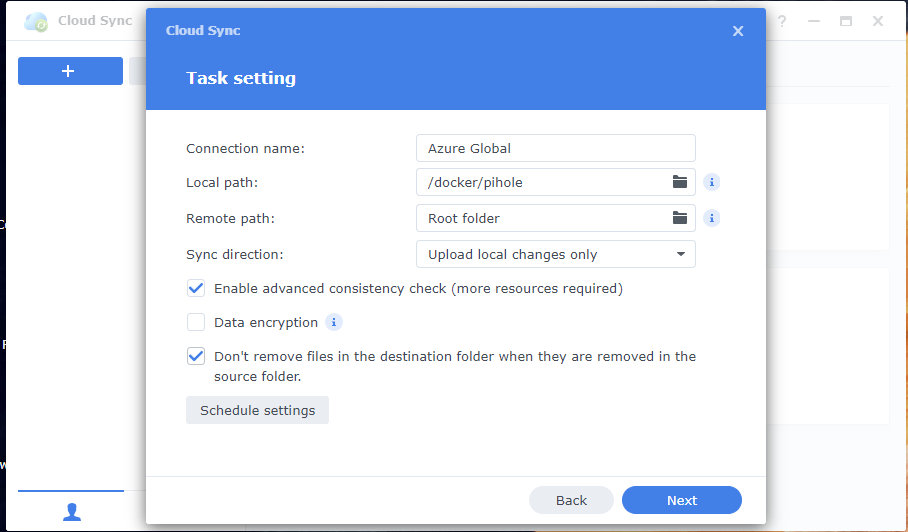 Now comes the part that we need to specify a file path on our Synology to upload towards our Azure Storage Account. In this example I used my Pihole docker container. You will also be able to specify a path within your Blob container if needed, else the Root folder option would suffice.