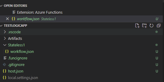 To start a new project within VS Code, press F1 and search for Azure Logic Apps: Create new project.... Create a new folder or choose an existing one. You will be asked to choose between Stateless or Stateful; in this example choose Stateless. After this, a basic project will be set up.
