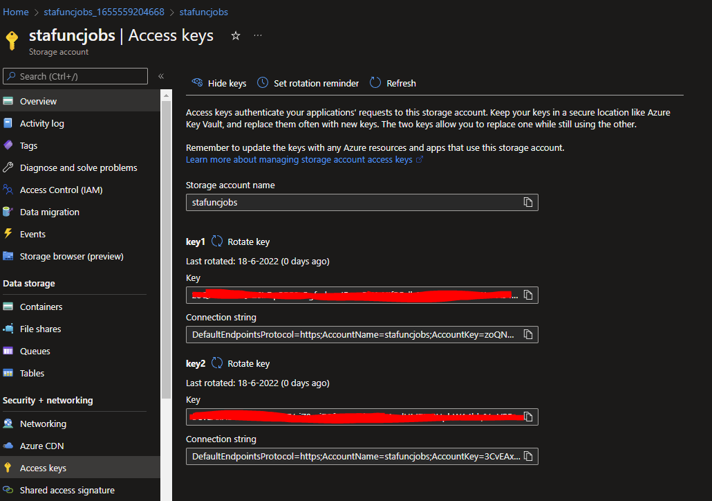 Copy the Connection string from Key1 and paste this in your Dockerfile. The key should look something like: DefaultEndpointsProtocol=https;AccountName=stafuncjobs;AccountKey={Key};EndpointSuffix=core.windows.net