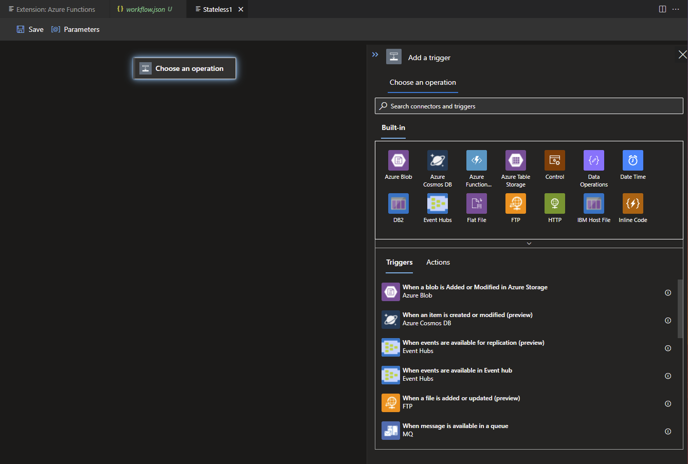 As seen in the image above, a limited amount of Triggers are available. This also goes for Actions, but if you have an existing Logic App that only uses the limited options available you will be able to copy and paste your code in the workflow.json file.