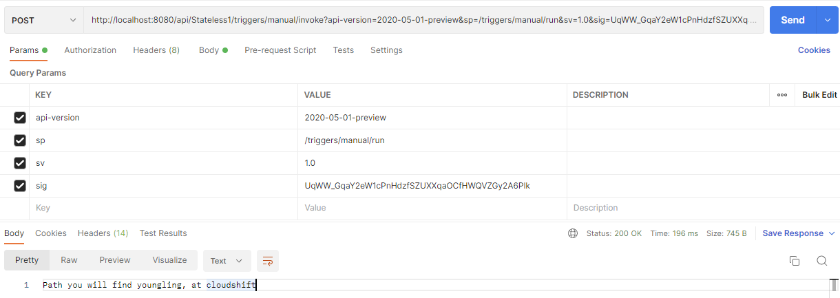 "value": "https://localhost:443/api/Stateless1/triggers/manual/invoke?api-version=2020-05-01-preview&sp=%2Ftriggers%2Fmanual%2Frun&sv=1.0&sig=UqWW_GqaY2eW1cPnHdzfSZUXXqaOCfHWQVZGy2A6Plk",