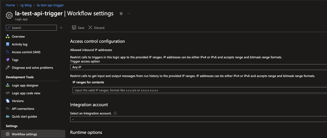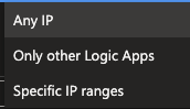 - Any IP, allowing everyone who knows the Logic Apps Endpoint to call it and trigger it in the process.