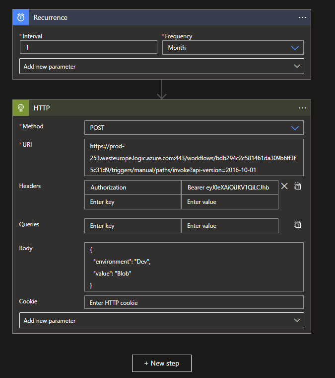 In most important part of the Logic App is the HTTP connector with the HTTP request action. As stated before it is important to that the Logic App URI doesn't contain the SAS attributes and that the request is of Methode POST.
