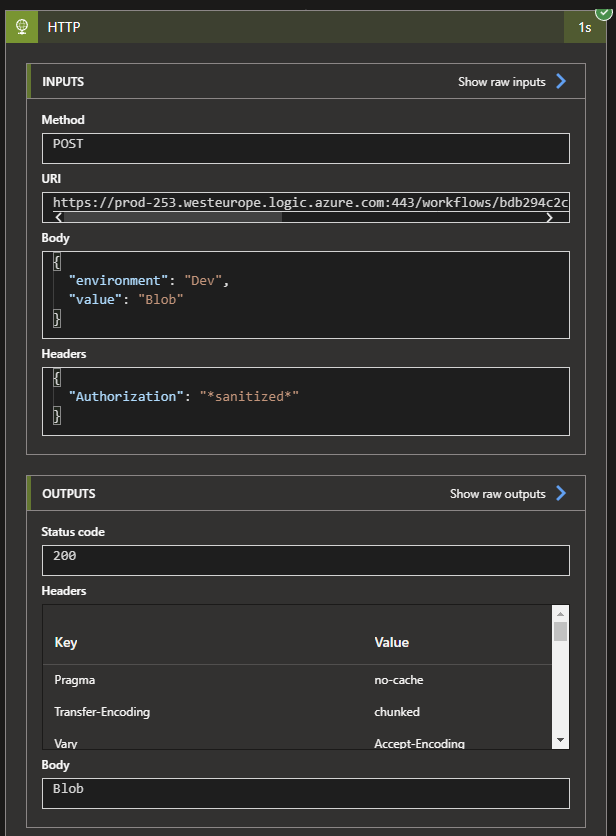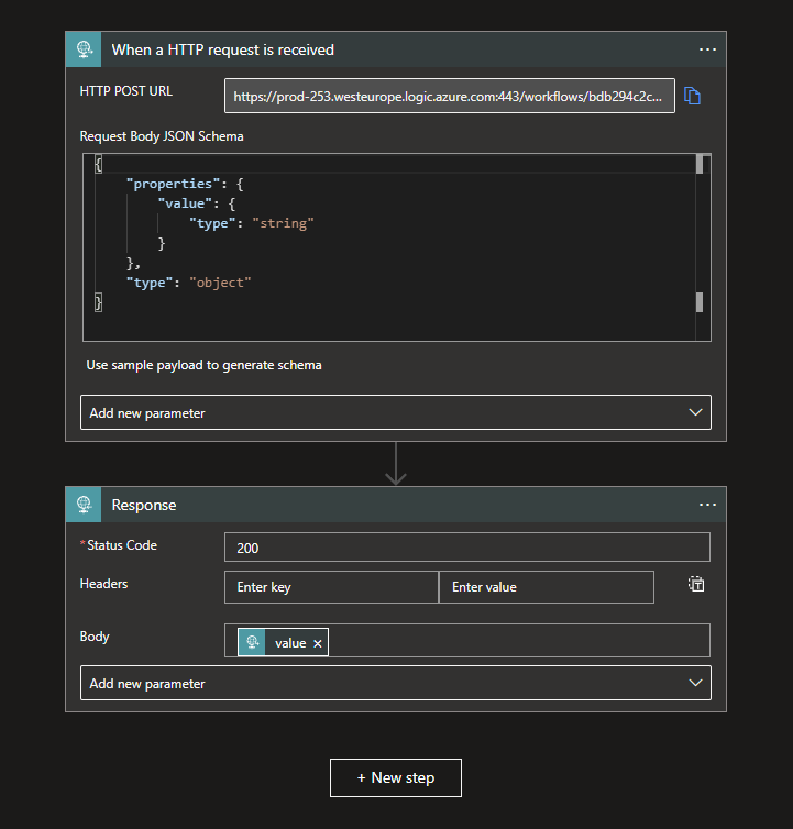 The Logic App that functions as a Endpoint in this example nothing more than a dummy. It will return the value that was specified within the Body of the request.