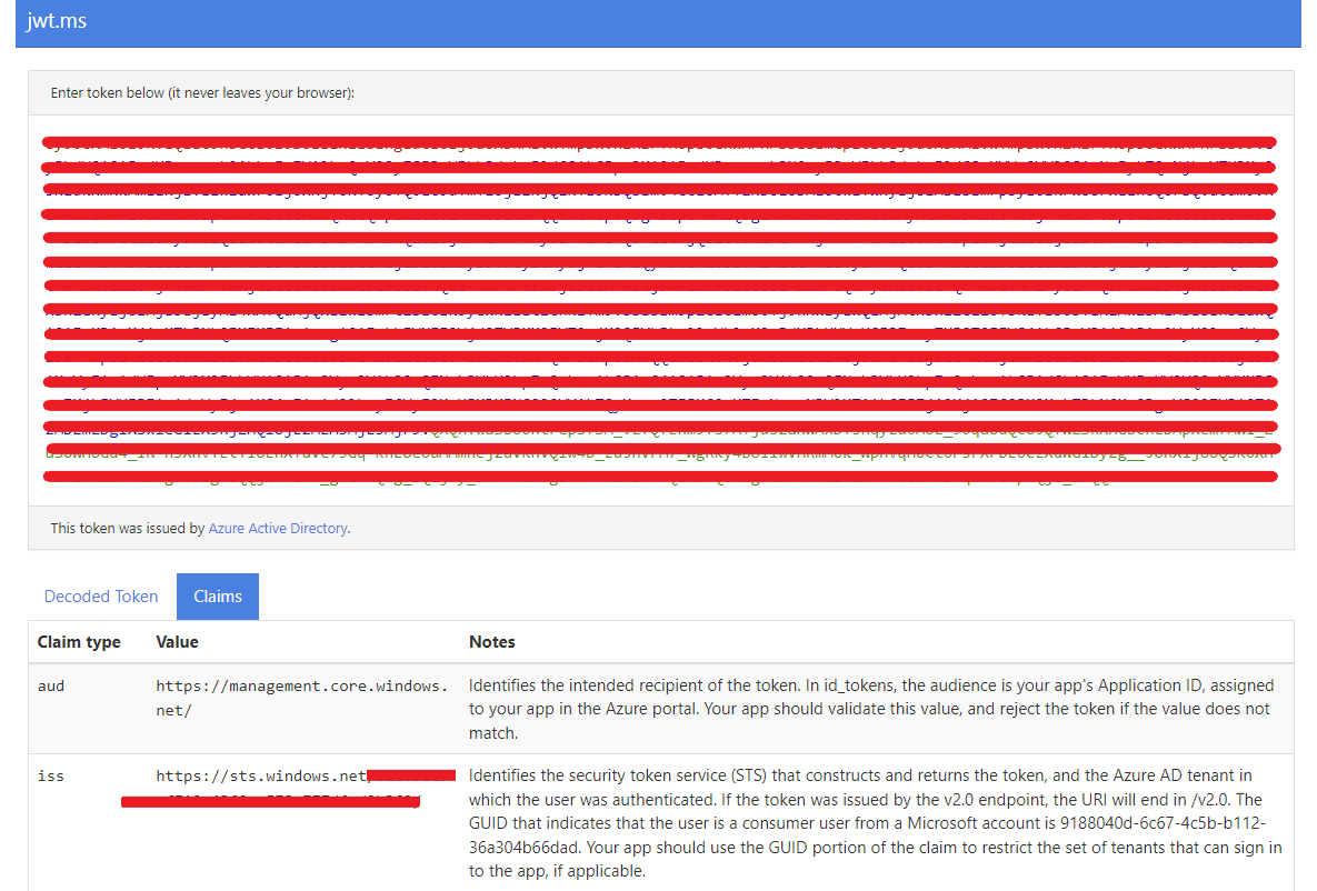 Now the Access token is quite a long string and since it has been encoded you can't see the Issuer and Audience in it. But luckily we can decode it with sites likes jwt.ms. If you paste your Access token on the site, it will decode it and show you the detailed information. Here you can also see if the Issuer needs to be https://sts.windows.net/ or https://login.microsoftonline.com/ for your Logic App Policy.