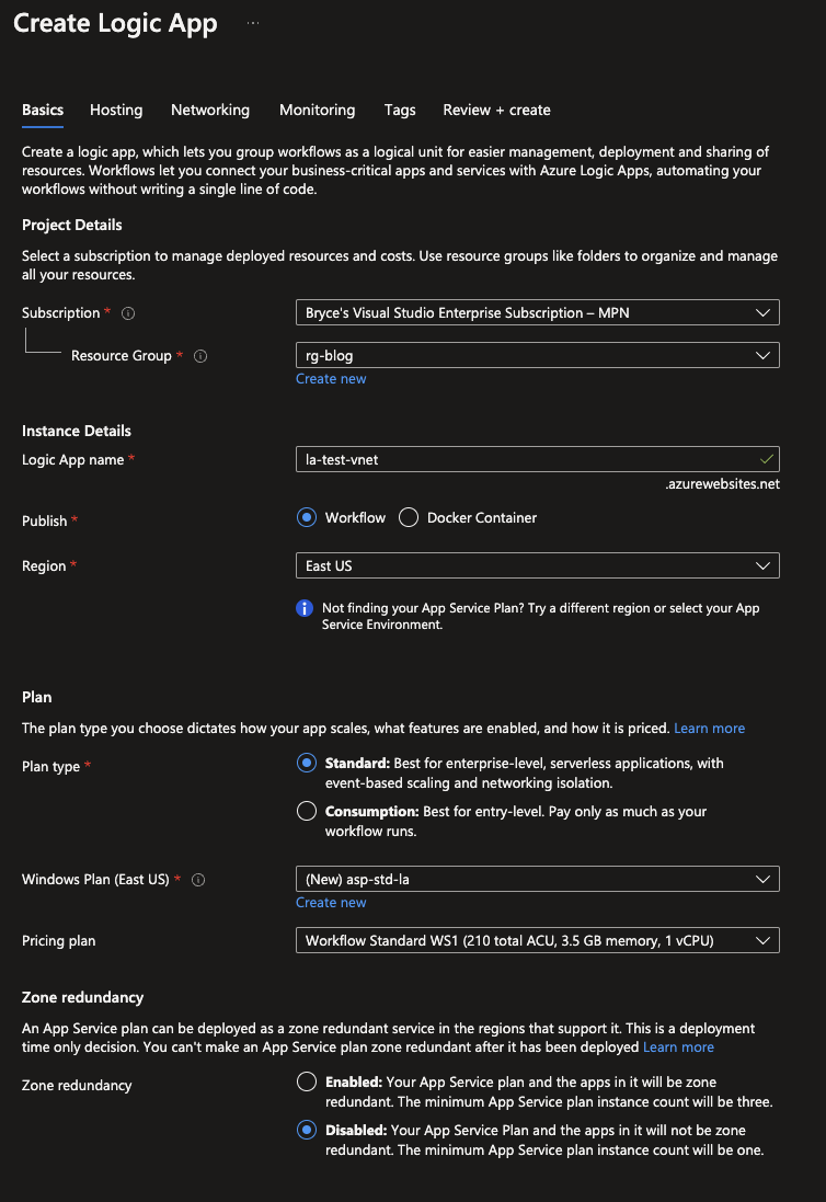 As stated it is possible to configure your VNET integration when creating the Logic App via the Azure portal. Go into the portal and start the Azure Logic App creation process. Make sure your Plan type is Standard. Since the Windows Plans/ App service plans are random genarated names, it is best to click on the Create new option and add some proper naming for it. If all is set, continue to the Hosting tab.