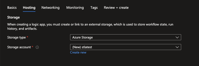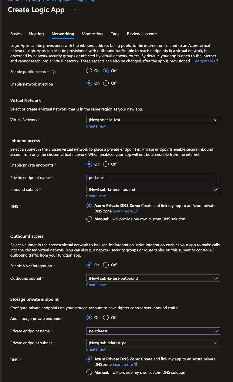 The same goes for the Hosting tab since it will contain an autogenarated name for the Azure storage account which is created due to the Standard based Logic Apps using the Azure Function runtime, which needs a Storage account to run. If configured continue to the Networking tab, where all the magic happens!