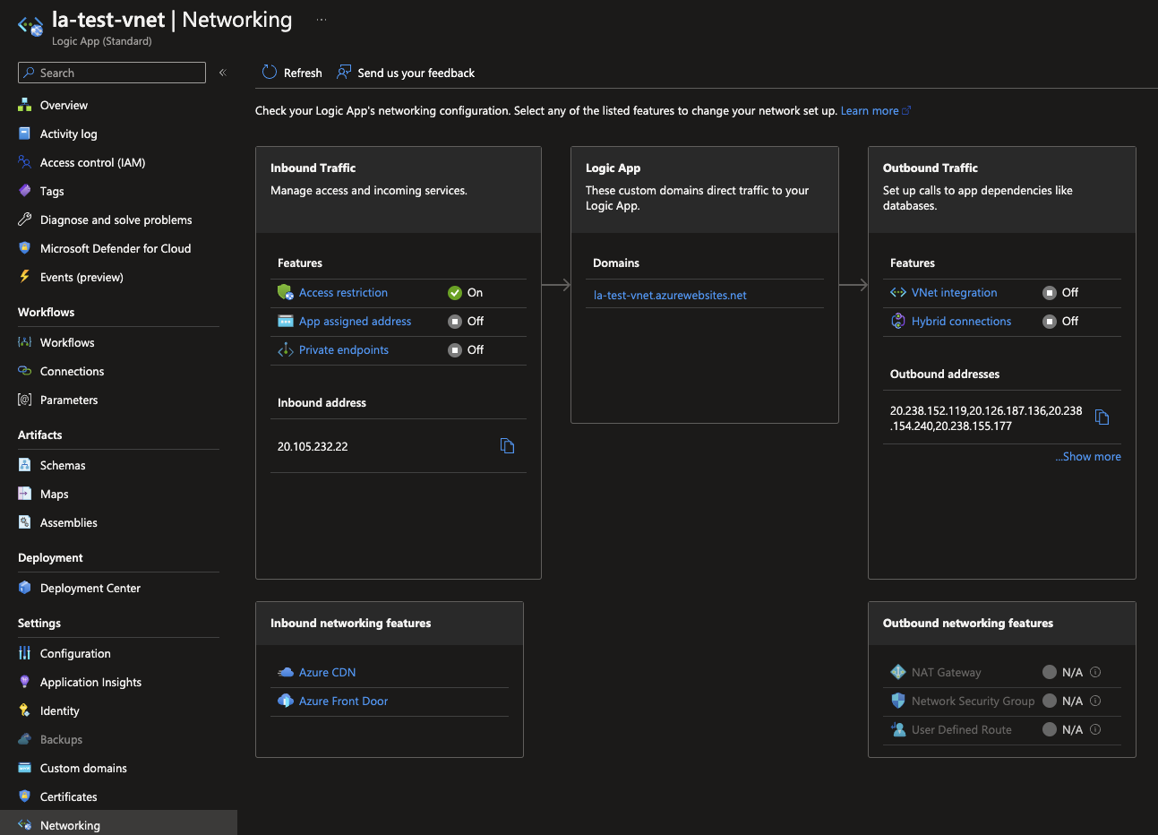 If you already have an existing Standard based Logic App, it is also possible to add VNET Integration if those services are already in place. Navigate to your Logic App and click on Networking underneath the Settings category.