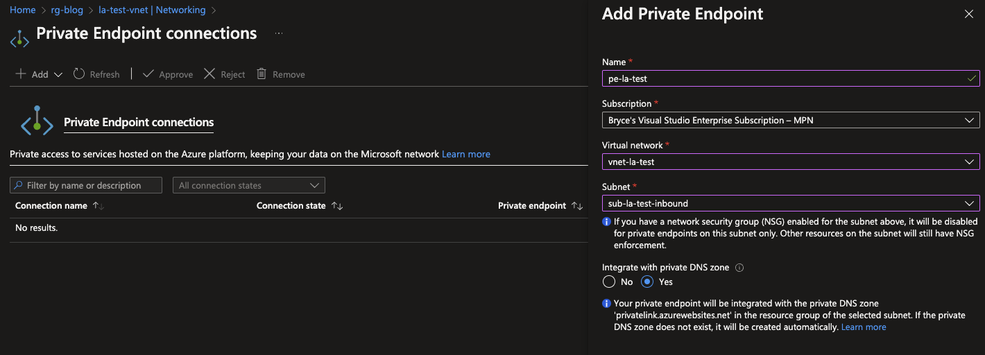 Same goes for the Private Endpoint connections. Click on + Add to start configuring a new Private Endpoint. For configuring the Private Endpoint both the VNET and Subnet would need to exist already.