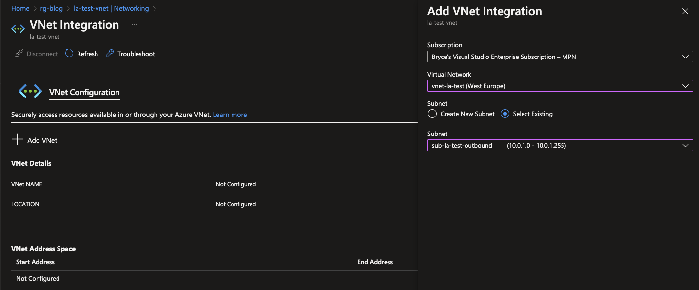 When clicking on the VNET Integration option, you will be able to add a VNET to your Logic App. Click on the + Add VNet to do so. You will need to select an existing VNET but are able to create a new Subnet if not available.