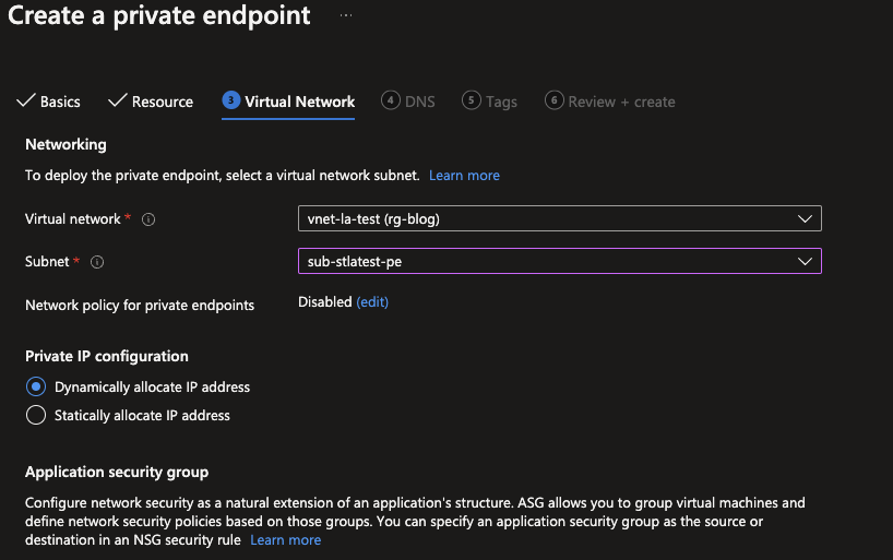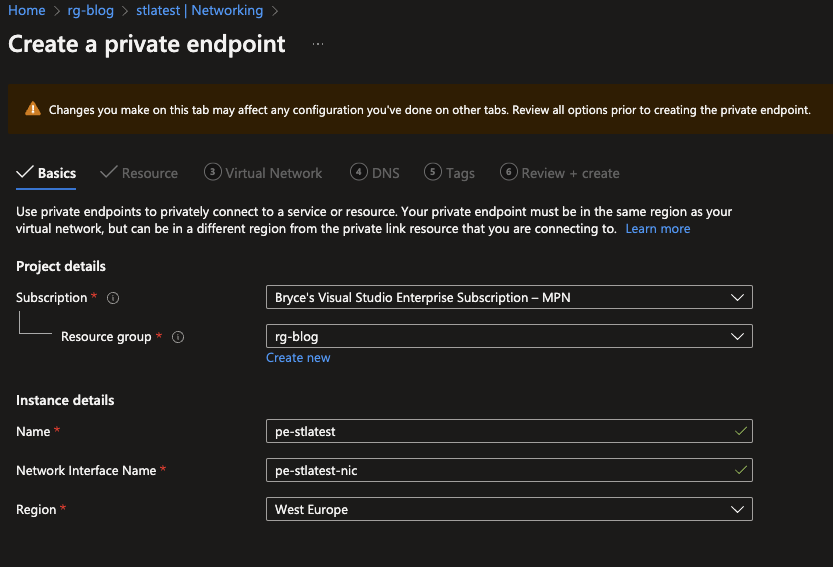 In the next tab, the Virtual Network can be added which is needed for the Private Endpoint to be part of. Also here it is only possible to select existing VNETs and Subnets. If everything is configured you can go to Review + Create and click on Create to deploy it. As stated you will have to do this multiple times if you want to enable multiple Private Endpoints for the different options (Blob, Files, Queue, Disk, Ftp, Web, etc).