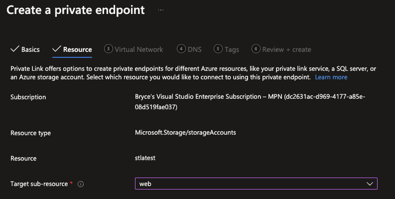 If you configured the naming for the Private Endpoint as well as the NIC can continue to the next tab, and select which target sub-resource you want to add it to. When creating the Private Endpoint during the creation of the Logic App, it will automaticly create it for every single option (Blob, Files, Queue, Disk, Ftp, Web, etc). It will be up to your needs to add each individual option if required.