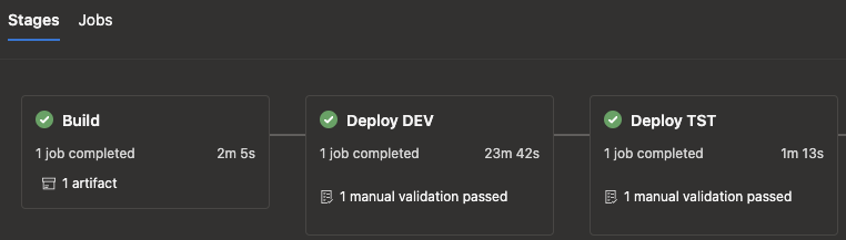 DacpacFile: $(Pipeline.Workspace)\drop\${{ parameters.projectName }}.dacpaAnd if you would run the pipeline for example for a Development and Test environment, you should be greeted with an overview as shown below.