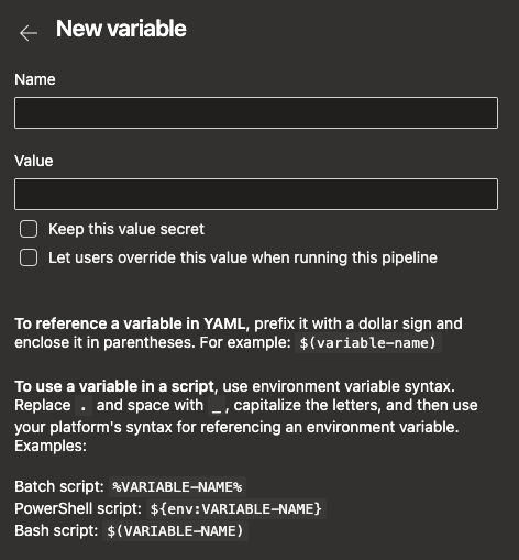 Before we look at the Deploy pipeline it is good to know that I use Variables within it. Of course it would also be possible to use some additional steps to get values from a KeyVault, but since these variables are hashed and can not be viewed afterwards, it should work for most cases. These Variables can be found in the right-top corner of your Azure DevOps pipeline next to the Run button.
